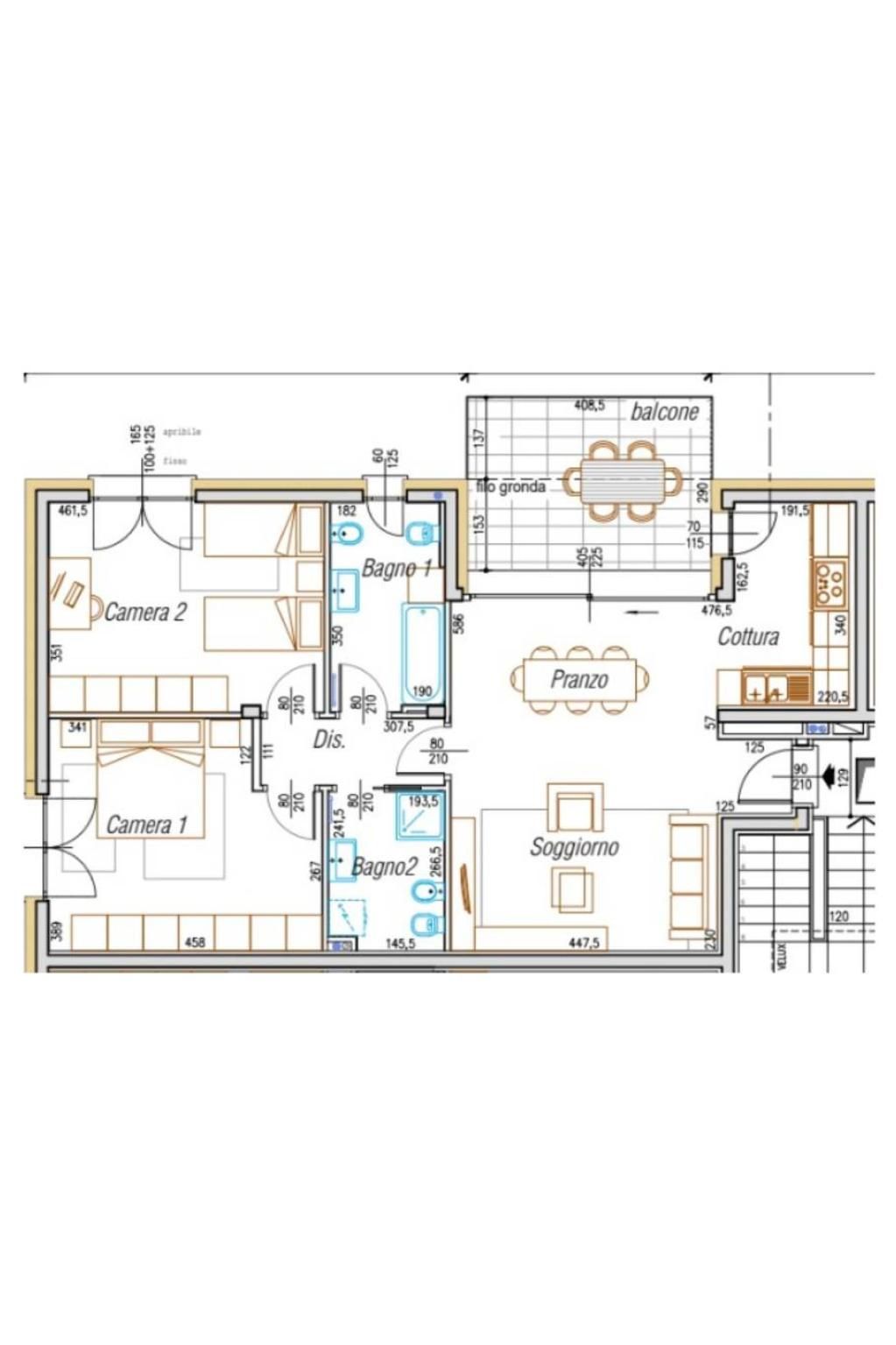L'ingresso è sul soggiorno con cucina a vista e affaccio sul terrazzo tramite ampie vetrate scorrevoli, mentre un disimpegno conduce alla zona notte, dove troviamo due camere matrimoniali, bagno di servizio con doccia e bagno padronale.